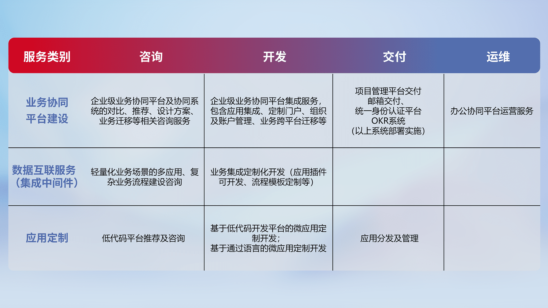 针对钉钉、、企微、、、IDaas等平台级产品提供产品的规划、、方案、、交付、、、、定制化开发等服务,,,,实现如统一协同办公、、、智能客户服务、、混合会议管理、、智能数据查询、、、等业务场景,,实现数字化转型。。